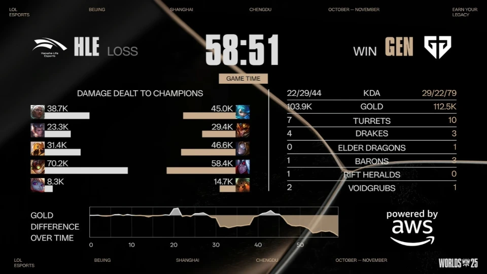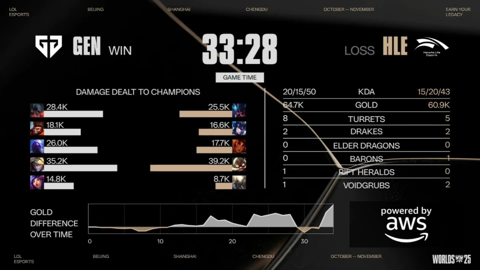 战至32分钟的后期决胜点,双方再度围绕大龙展开决战。HLE上单Zeus的挖掘机出现致命失误被秒,GEN乘胜追击至龙坑上方主动开团,打出一波1换4的完美团战,最终锁定首局胜局。据赛后统计,HLE.Viper所使用的飞机在本局比赛中打出了全场最高伤害。
