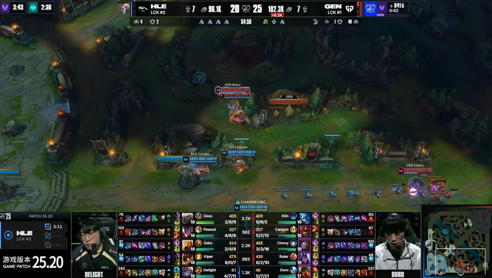第三局HLE上单兰博,打野巨魔,中单永恩,下路希维尔加洛;GEN上单赛恩,打野蝎子,中单维克托,下路卡莎加巴德。对线期双方有来有回,15分钟双方争夺峡谷先锋,canyon蝎子拿下先锋,但是Kiin赛恩大招和Duro巴德大招配合失误,Ruler卡莎被秒,HLE击杀GEN三人,前期HLE经济领先1K。