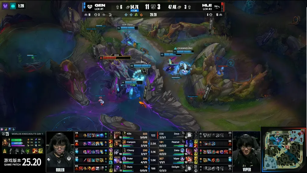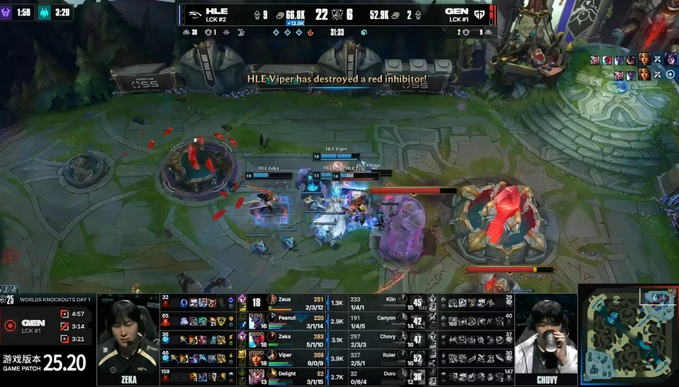 最终58分钟双方中路拉扯,peanut赵信被开,GEN击杀HLE三人后,拿下第二局的胜利。这局伤害最高的是Viper炸弹人。