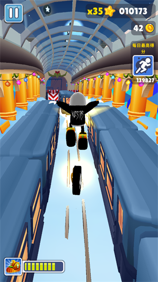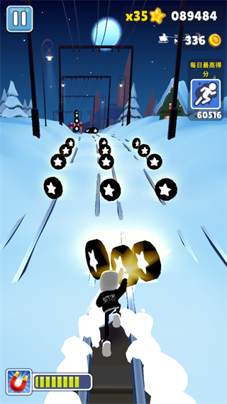 滑板 ,通过双击屏幕来启动滑板,滑板会持续一段时间。在没有滑板的情况下,角色撞到火车或者障碍等都会被抓住,游戏终结。但在有滑板的状态下,角色就有了一道保险,撞到火车等的时候,滑板会消失,游戏可以继续进行。