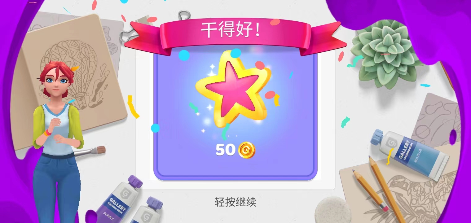 画廊中还有大量的道具涂色书和装饰品来帮助你,炸弹可以瞬间将某个区域填满颜色,放大镜可以帮你快速找到某种颜色的位置,而涂色桶则可以帮你填上相同的颜色。游戏非常适合在无聊的时候打发时间,卡通风格的精致非常吸引眼球,喜欢这类经营类游戏的朋友可以来试试。