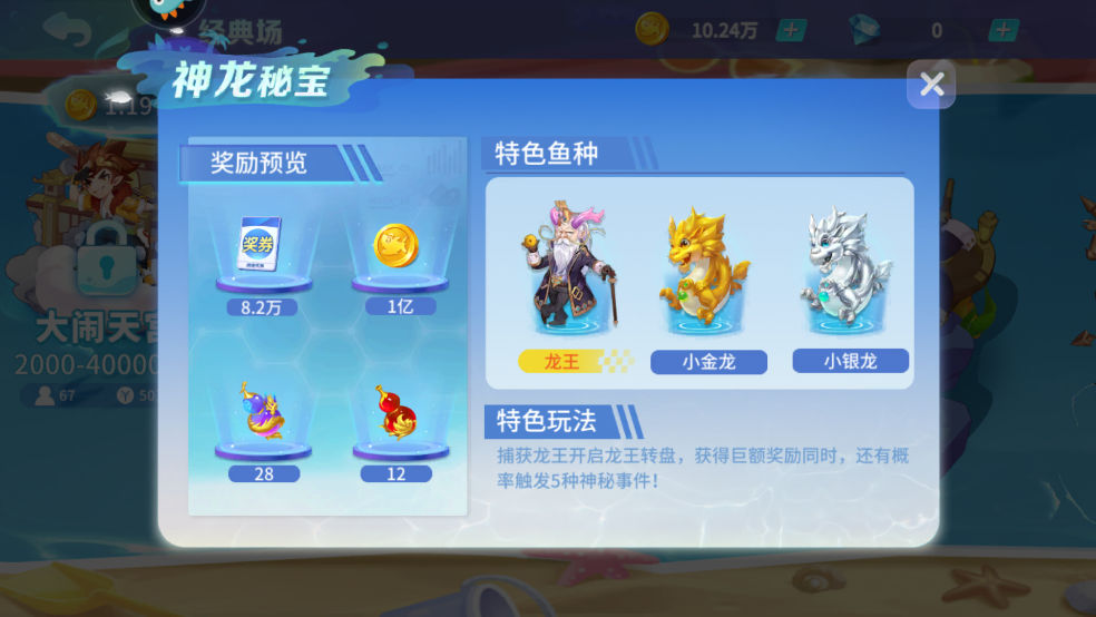 特色玩法:捕获龙王开启龙王转盘,获得巨额奖励同时,还有概率触发5种神秘事件!