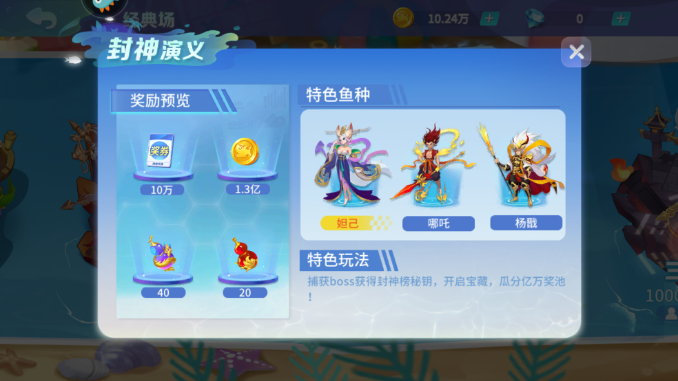 特色鱼种:妲己、哪吒、杨戬