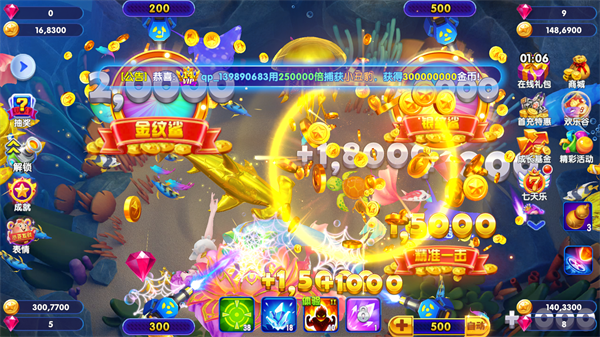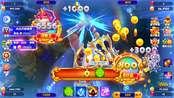 玩友们在渔场中猎杀炸药桶和电鳗可以实现金币财富暴富式的增强,同样如果奖金池的金币累积到一定数额还可以参加奖励丰厚的普通抽奖,如果你的颜值够高,那么获得钻石获得金币都不是梦。比如:当你积攒的奖金池金币高于800000就可以颜值抽取最高2000000的金币奖励。