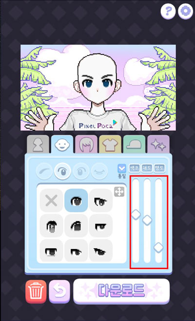 4、在选择眼睛的框架中,拖动右边的滑竿可以改变眼球颜色和亮度等