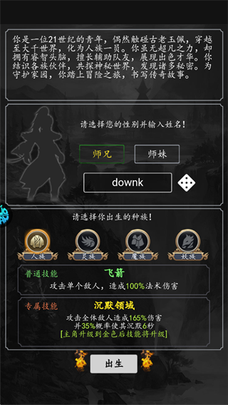 可选择性别【师兄/师妹】、输入姓名,从人、灵、魔、妖种族中选出生种族,不同种族技能不同。