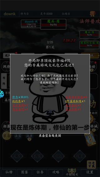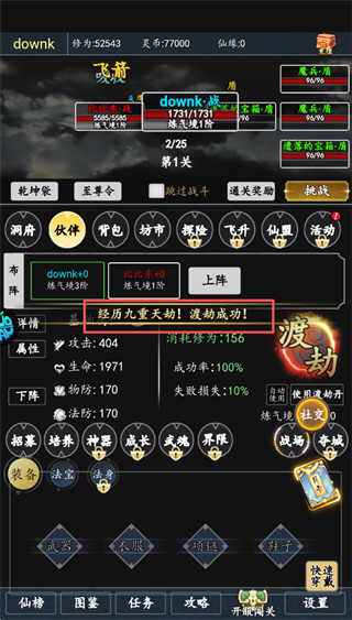 胜利可获仙缘、灵币、修为,通关200关得红色伙伴令。