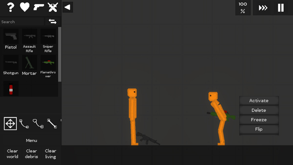 3、进入游戏如图,玩家可以自由添加物品、人物、武器等;
