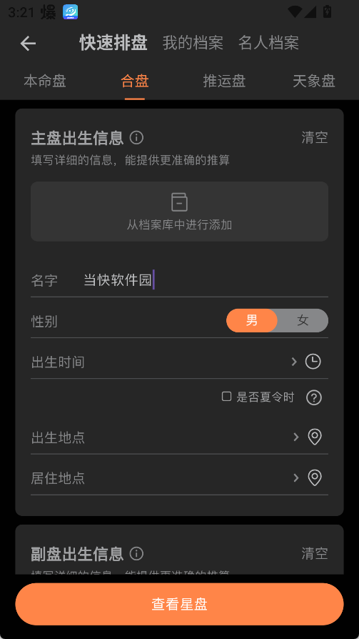 参考上面对应的“如何进行排合盘”流程,只不过在星盘档案页面,静静选择一个档案即可