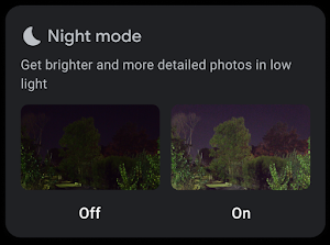 您可以更改照片和视频设置。例如,您可以开启或关闭夜间模式、闪光灯、定时器。