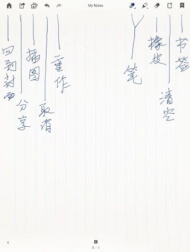 2、双击笔记可以新建一个空白页,对应上图的注释,上方功能列表从左至右分别为:返回封面、分享、上一步与下一步、画笔、马克笔、橡皮擦、清除整页以及设置标签。