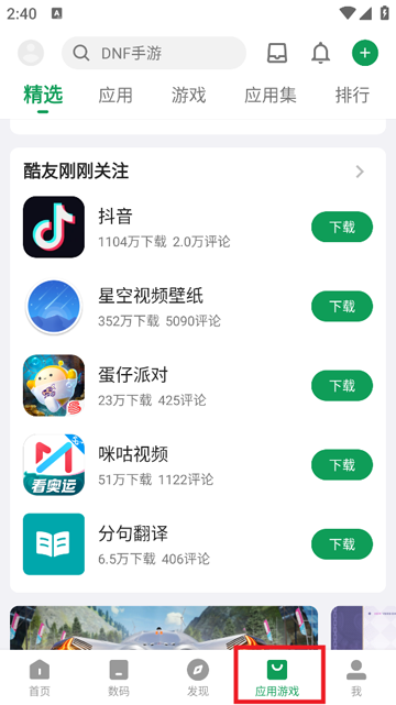 2、点击软件最下方的“应用游戏”菜单,进入下载频道