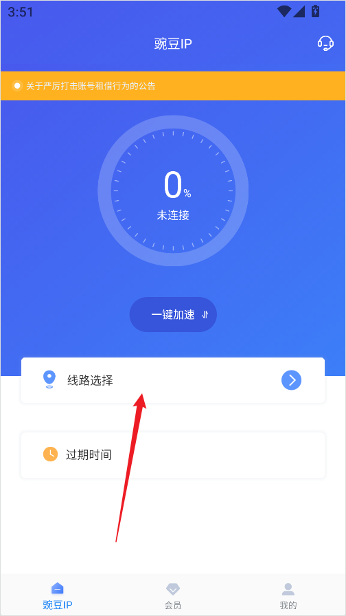 1、如果你觉得当前使用的IP不理想,想要更换一个新的IP,可以先打开APP,在首页点击【线路选择】。