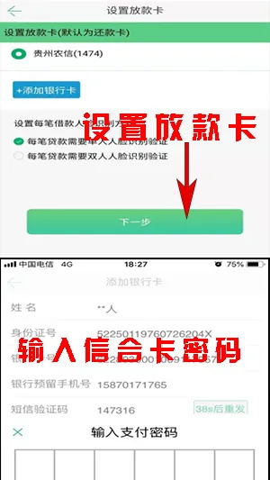 人脸核实通过,跳转【设置放款卡】:后台将自动查询您绑定的信合卡显示在页面,且可点击【添加银行卡】按钮添加新信合卡,设置每笔借款人脸识别的方式。