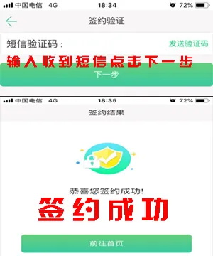 签约成功:收到短信验证码,输入正确后确认提示签约成功。