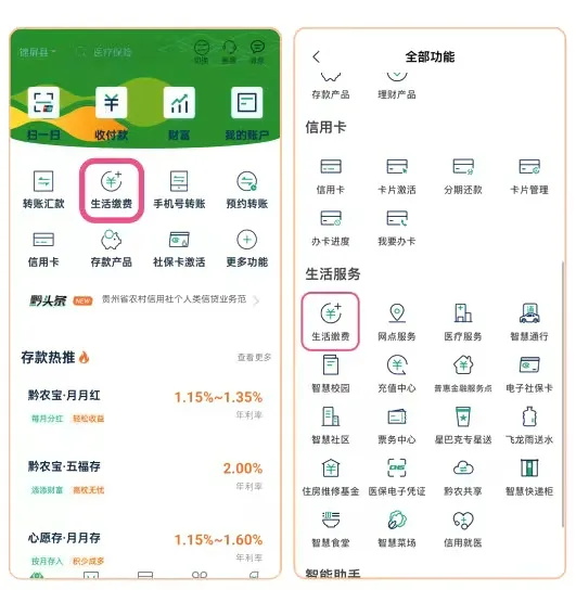 步骤一:打开并登陆黔农云APP,点击首页“生活缴费”(或点击“更多功能”,选择“生活缴费”)。
