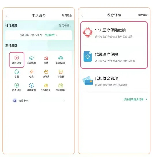 步骤二:点击“医疗 保险 ”,个人缴费选择“个人医疗保险缴纳”,他人代缴选择“代缴医疗保险”。