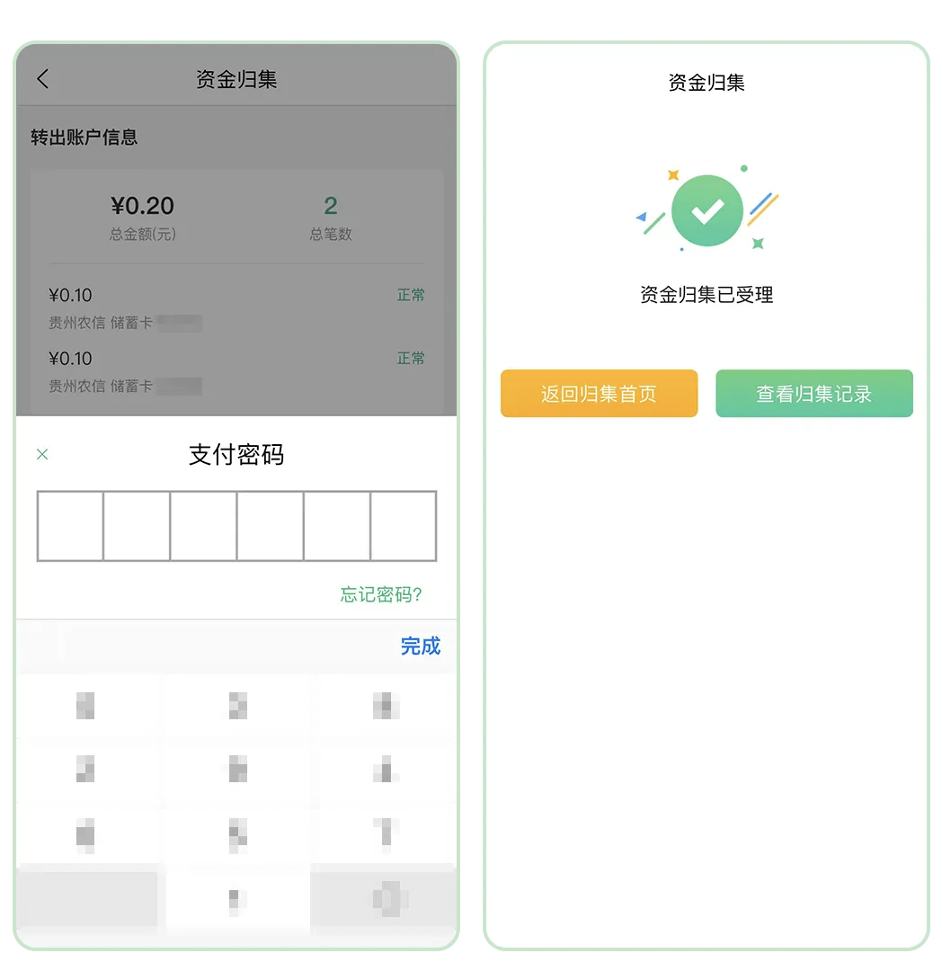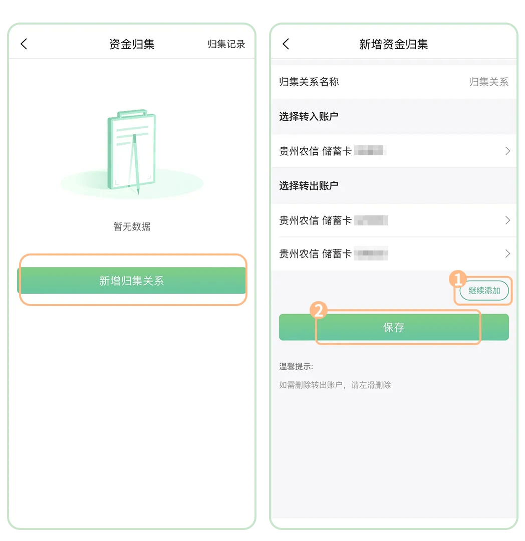 温馨提示:资金归集功能目前仅支持本人名下在贵州农信开户的储蓄卡使用哦!