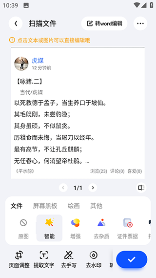 精准识别图片中的文字,支持逐字或按段落选择复制,并可转换至Word文档进行编辑,保持原有排版。