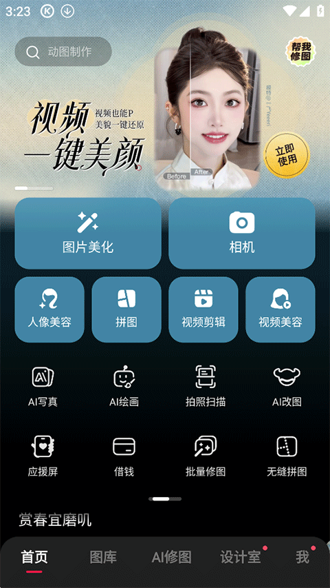 7、美图AI全家桶:集成多种AI能力,包括AI绘画自由创作、AI智能修图、AI人像美容辅助和AI视频高效处理,全面提升编辑效率与效果。
