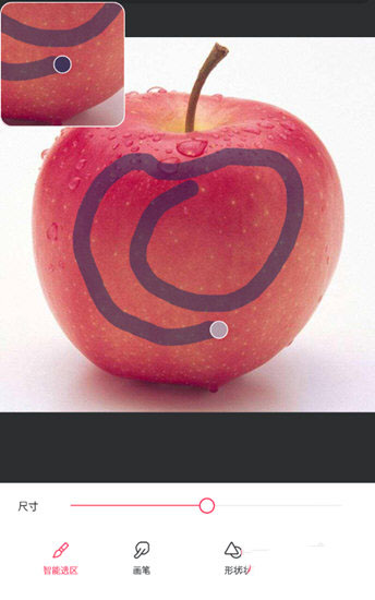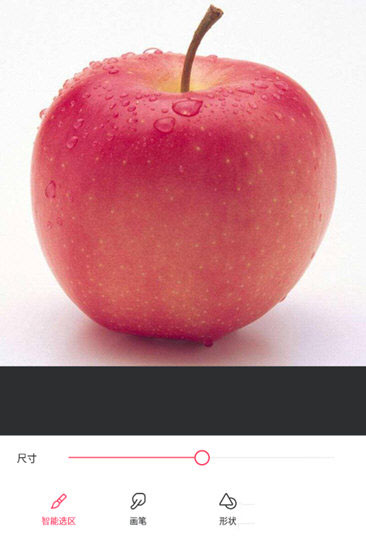 3、如果你的图片背景颜色为统一的色调,那么推荐采用【智能选区】模式,然后再用手指在要抠的物品上拖动选择抠图范围,系统自动用红色的背景来表示。如果不满意,则使用【橡皮】功能来抹除不想要被抠出的部分。